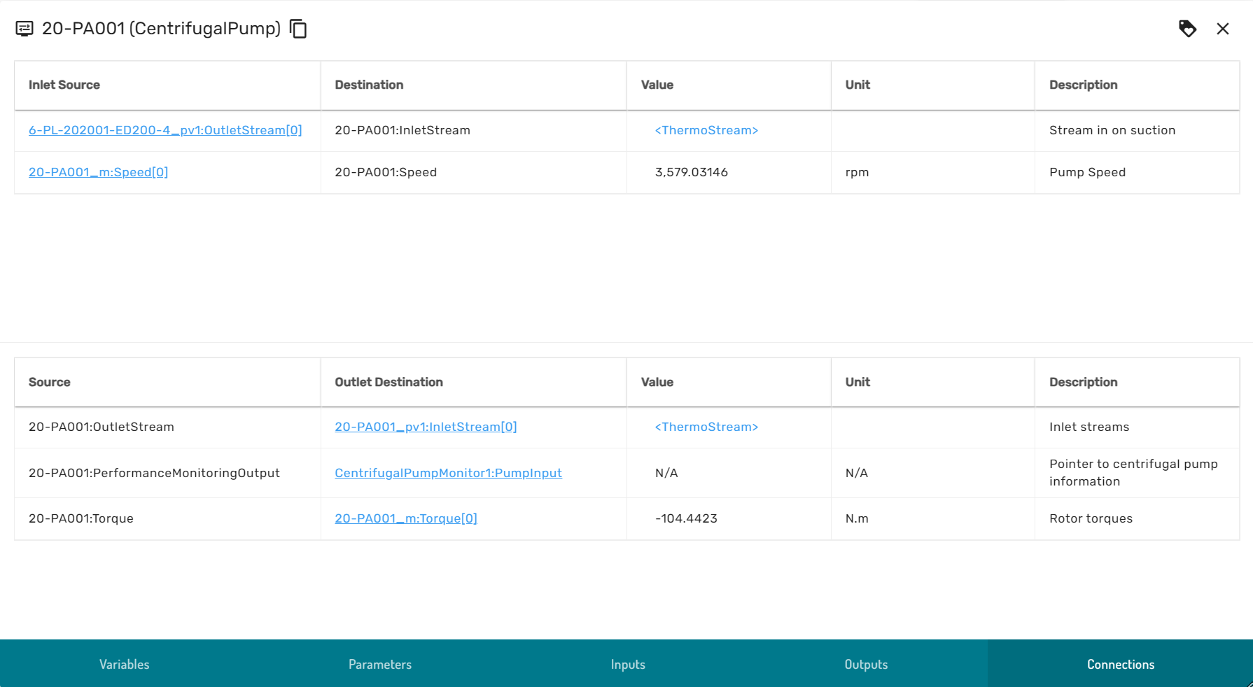 By clicking on the blue hyperlinks, the browse connection dialog traverses along the model topology graph to the adjacent incoming upstream module or subsequent downstream module. If a connection is of a primitive type (numeric, boolean or enumerator) the value of the connected variable is displayed, otherwise a hyperlink to the variable viewer is provided.