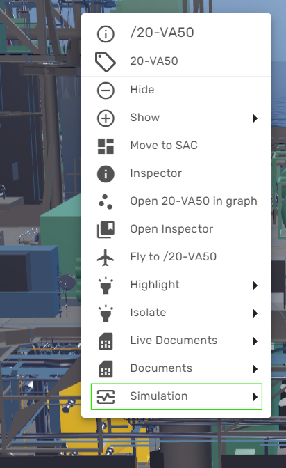 If the simulation workflow is enabled in Kognitwin, it can also be accessed from other workflows through the typical Kognitwin Context menus.