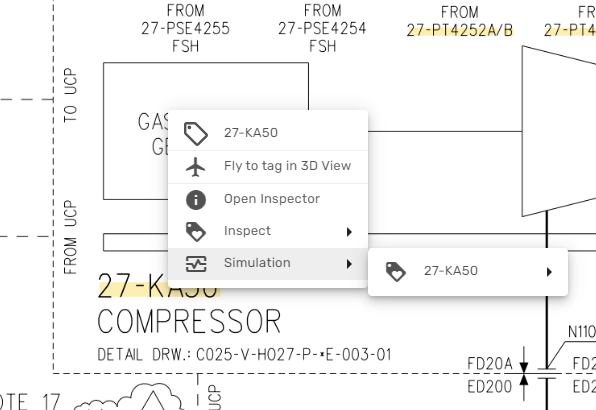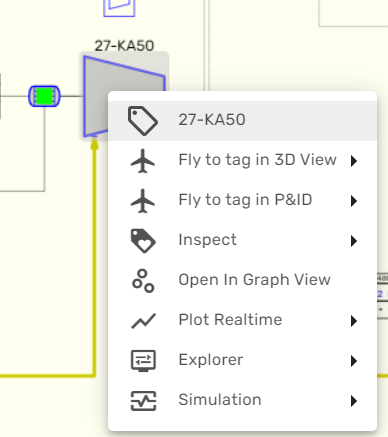 If the simulation workflow is enabled in your environment, you can at any point open the right-click context menu for a specific object or tage (for example from 3D or from a P&ID) and fly to the corresponding tag in the Always-On Dashboard: