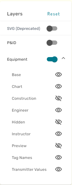 By clicking on the eye-icon, the respective layer can be shown or hidden. For certain graphics, a special "P&ID" layer is available. This layer contains the Process and Instrumentation Diagram that the simulation graphic has been built from.
