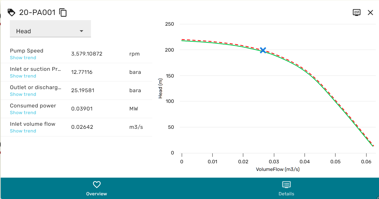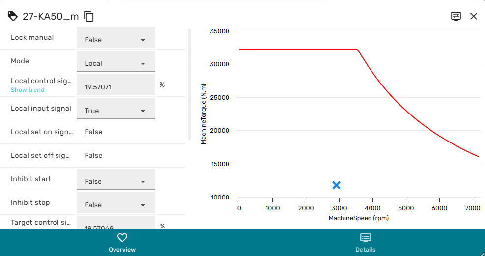 Facplates are generally build up from two main areas, the left area containing the most important variables and their current value, and the right area, that can depict a relevant trend or performance map for the specific equipment.