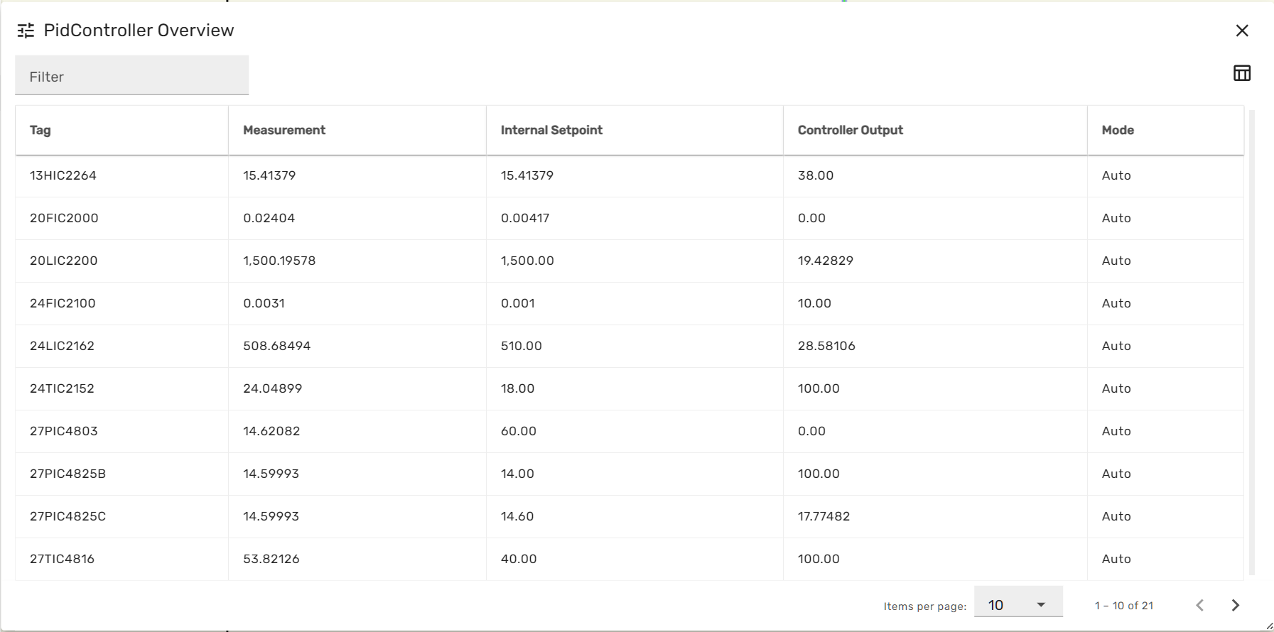 Each module overview menus list all modules of a specific type across the entire simulation model, together with some of the most important variables for this module type. The grey filter box in the upper left corner allows to enter a string, which will be applied as a filter on the module names. Thereby the list can be limited to selected entries.