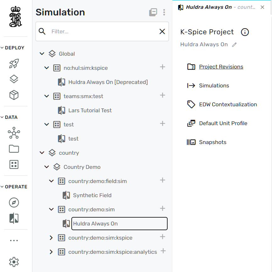 In this menu, a simulation project needs to be selected from the navigation tree (in this example case "Huldra Always On"). Now, the simulation project can be administered using the following configuration categories: