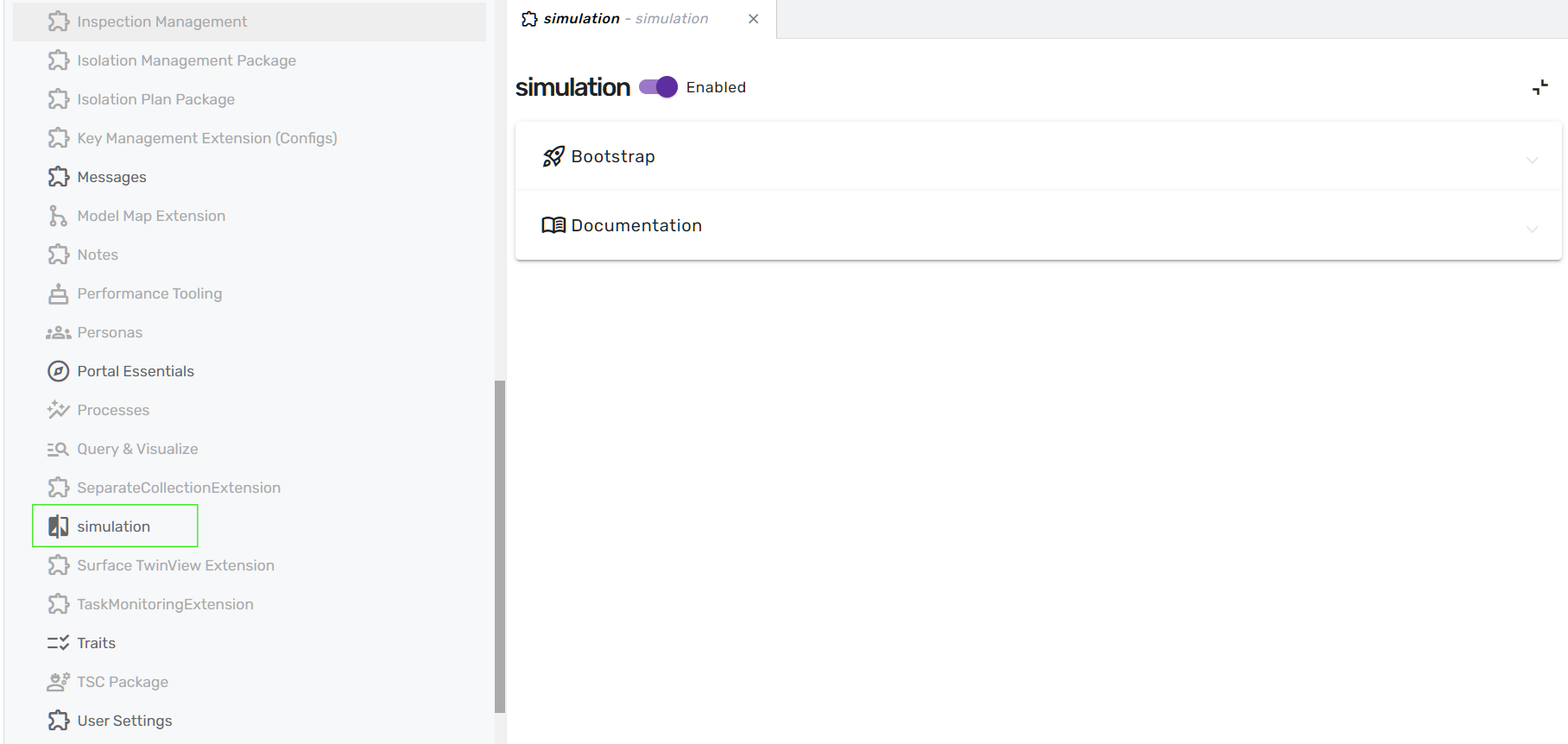 In the new menu stripe that opens, the Simulation category needs to be selected from the list. Clicking on the simulation menu entry will then allow the user to enable the simulations extension by moving the slider to "enabled"