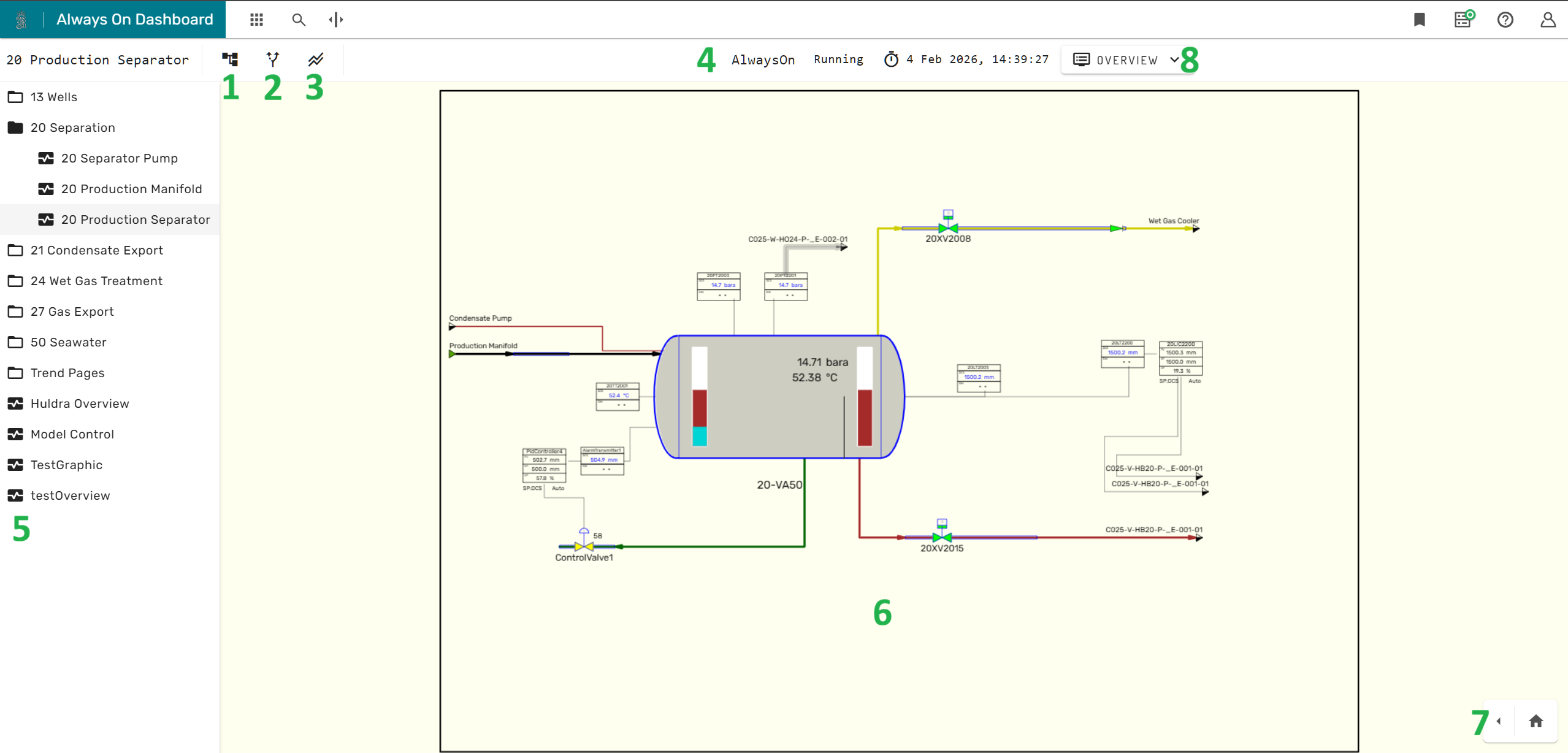 The tree structure icon 1 in the main menu bar shows or hides the process graphic navigation menu 5 on the left side of the screen.