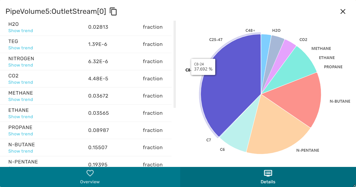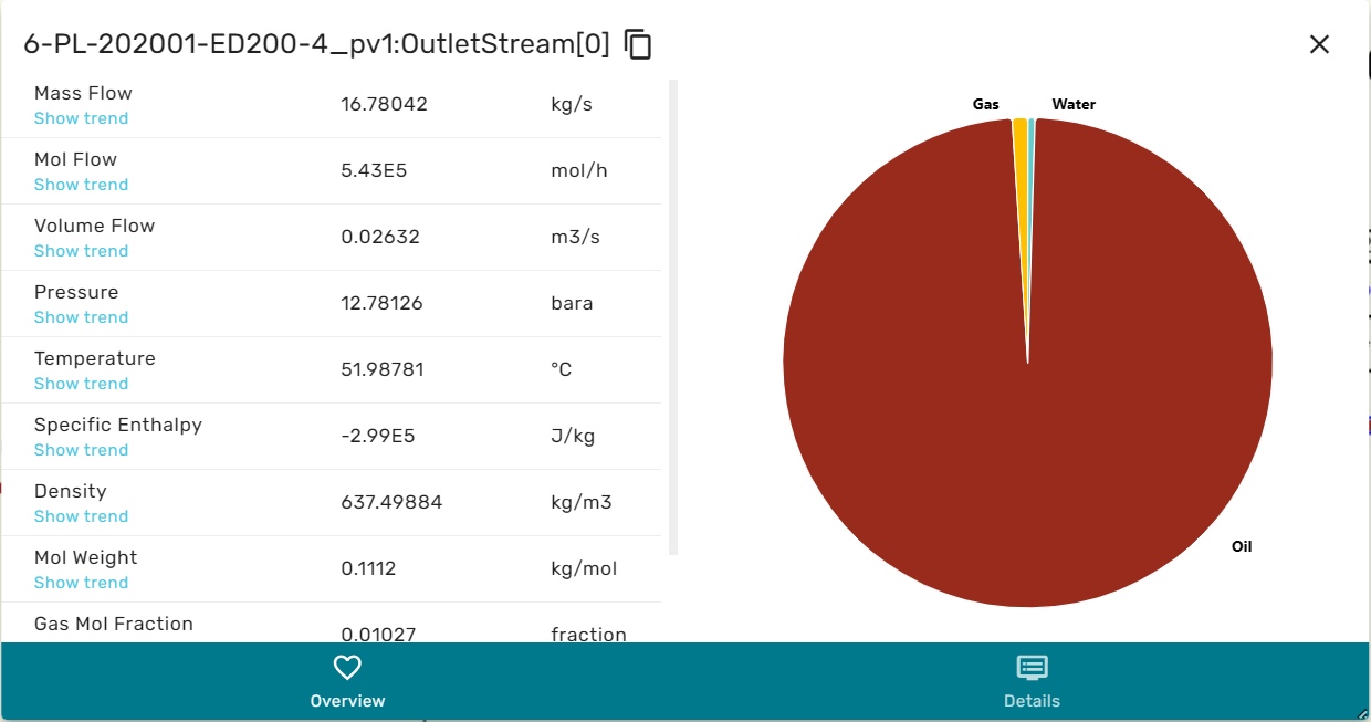 When in overview, the he left area contains a selection of the intensive and extensive thermodynamic properties of the stream, as for example massflowrate, temperature, enthalpy etc. The right area contains a cake diagram of the fluid phases (e.g. oil, gas water). By hovering the mouse over the cake diagram the numerical values for the phase fractions are displayed.