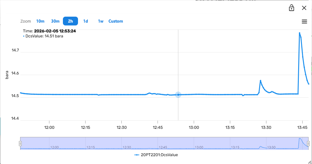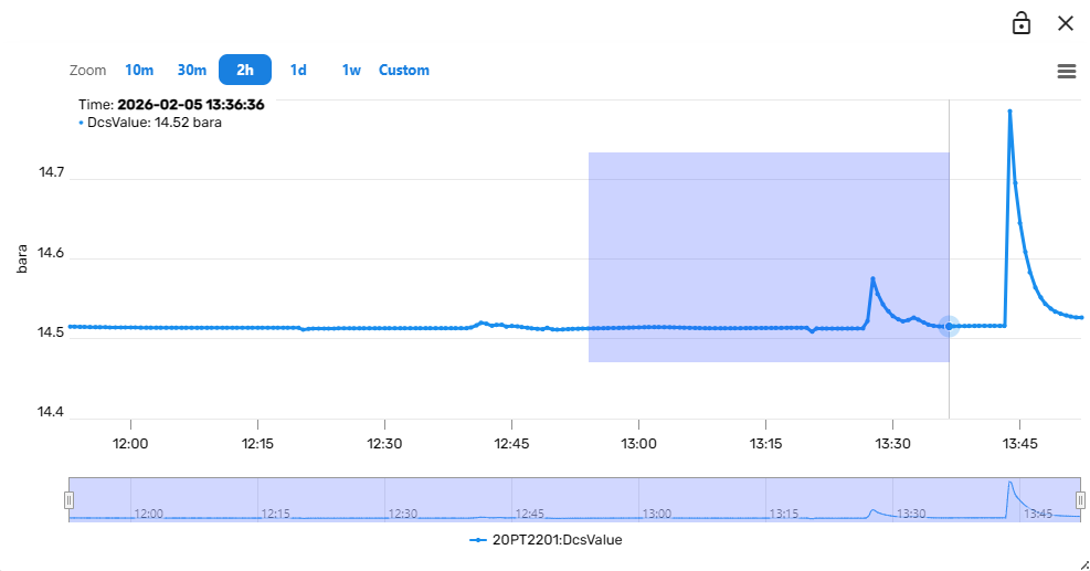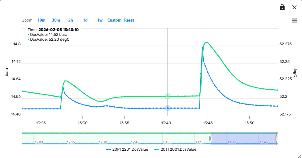 In many cases it will be useful to compare the trends of multiple variables within the same plot. This can be achieved by clicking on the lock symbol in the upper right corner of the trend component. Subsequently, clicking on a "Show Trend" link from the Simulation dashboard (for example from a Module Faceplate) will then add the variable to the existing trend instead of opening a new trend component. In this way, composite trends of multiple variables can be constructed interactively.