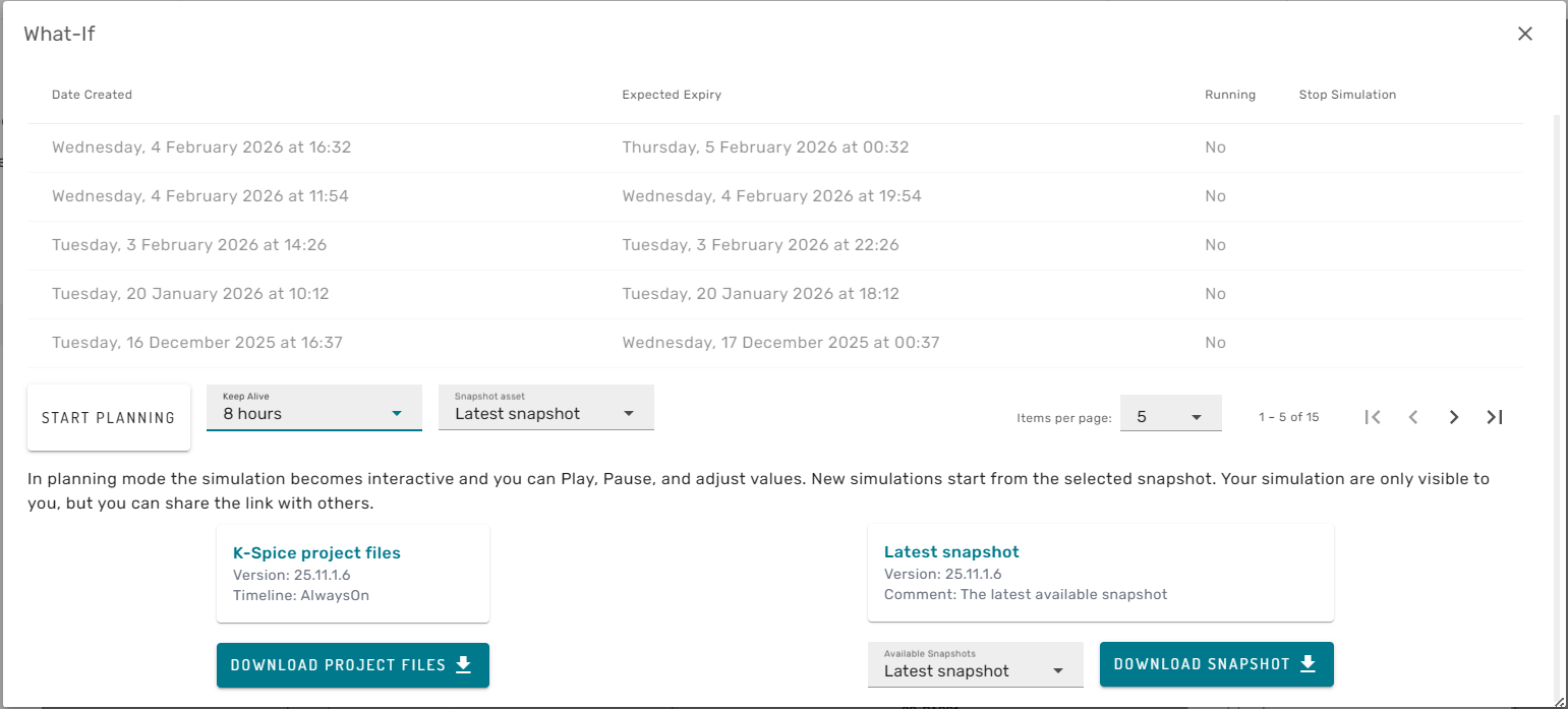 In the top of the dialog the user can se a list of active and expired What-If simulation instances. In the lower section of the dialog, the simulation project files and selected snapshots from the Always-On Simulation can be downloaded to the local computer, to enable on-prem What-If simulations in the corresponding desktop software (for example K-Spice Engineering).