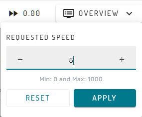 Once the What-If instance is ready, the main menu bar of the Simulation Dashboard provides altered functionality. The user can now start and stop model execution using the play and pause button. Furthermore, the target simulation speed can be changed by clicking on the number in the very right of the main menu bar. A new simulation speed can be set by using the + and - icons or by entering a number using the keyboard, and confirming the selection with the Apply button.